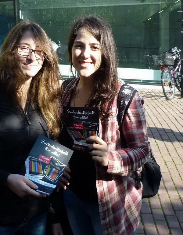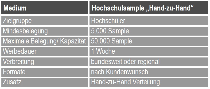 An Hochschulen können Sie Flyer, Prospekte, Produktproben, Postkarten und Zeitungen über uns bundesweit oder an bestimmten Hochschulstandorten sampeln lassen. Die Verteilung in oder vor der Hochschule oder Universität erfolgt in der Regel über Studtenten vor Ort mit Zustimmung der jeweiligen Hochschule oder Studentenwerkes über eine Hand zu Hand Verteilung.